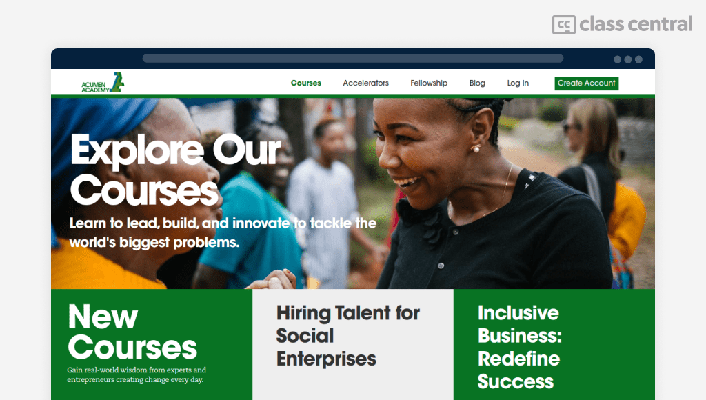 Acumen offers 15 free scheduled team certificate courses about social change. You can receive a Statement of Accomplishment after submitting all of the required assignments before the final day of the course.