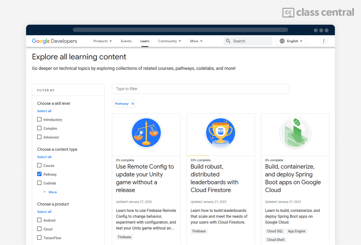 The Google Developers Platform offers a wealth of resources for professional and aspiring developers. In particular, the platform has over 1000 online courses from beginner to advanced levels to learn: